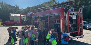 Bezpieczna droga do szkoły w praktyce. Strażacy ze Świętochłowic pokazali najmłodszym, jak unikać zagrożeń