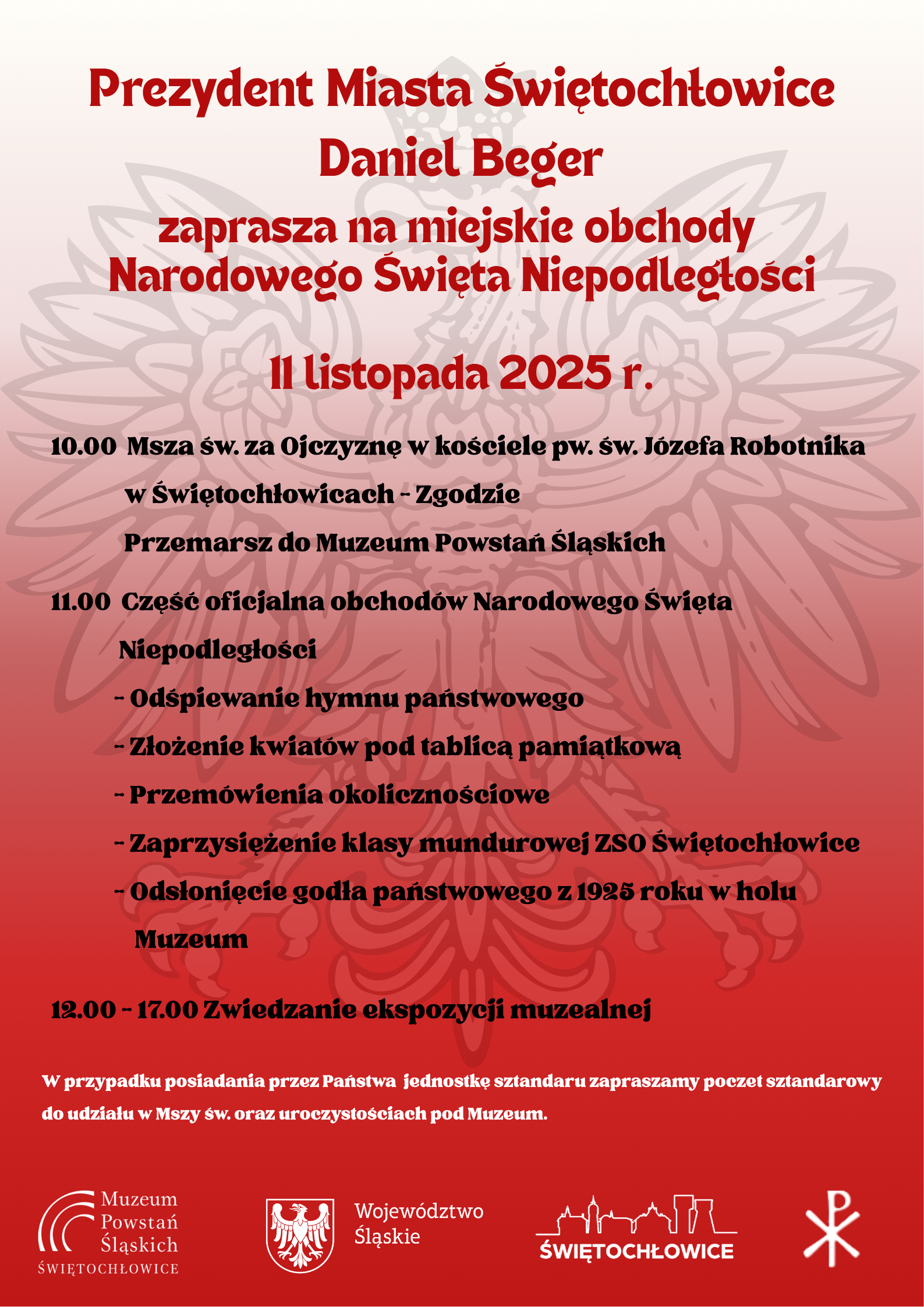 Obchody Święta Niepodległości 11 listopada rozpoczną się o godz. 10:00 w kościele pw. św. Józefa Robotnika w Świętochłowicach-Zgodzie, gdzie odprawiona zostanie msza święta za Ojczyznę. Po jej zakończeniu uczestnicy przemaszerują do Muzeum Powstań Śląskich, gdzie o godzinie 11.00 rozpocznie się część oficjalna. W programie przewidziano odśpiewanie hymnu państwowego, złożenie kwiatów pod tablicą pamiątkową, przemówienia okolicznościowe, zaprzysiężenie klasy mundurowej ZSO Świętochłowice oraz uroczyste odsłonięcie godła z 1925 roku w holu Muzeum.