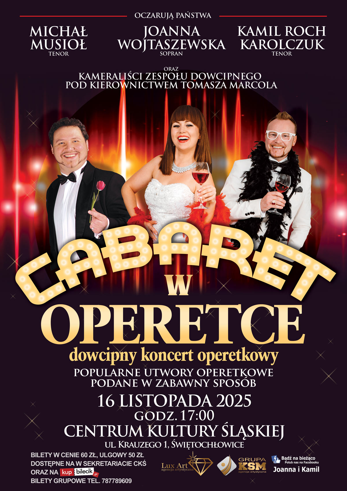 16 listopada 2025 roku o godz. 17:00 w Centrum Kultury Śląskiej w Świętochłowicach odbędzie się niezwykły koncert „Cabaret w Operetce”. To wydarzenie, które łączy w sobie przepiękną muzykę operetkową z lekką, pełną humoru formą kabaretową. Publiczność czeka roztańczony, dowcipny i momentami zwariowany spektakl, w którym klasyczne arie i duety operetkowe zostaną podane w zupełnie nowej odsłonie – na wesoło, z dystansem i energią. Artyści zadbają o to, by widzowie otrzymali solidną porcję endorfin i dali się porwać do świata operetki, która potrafi bawić do łez.