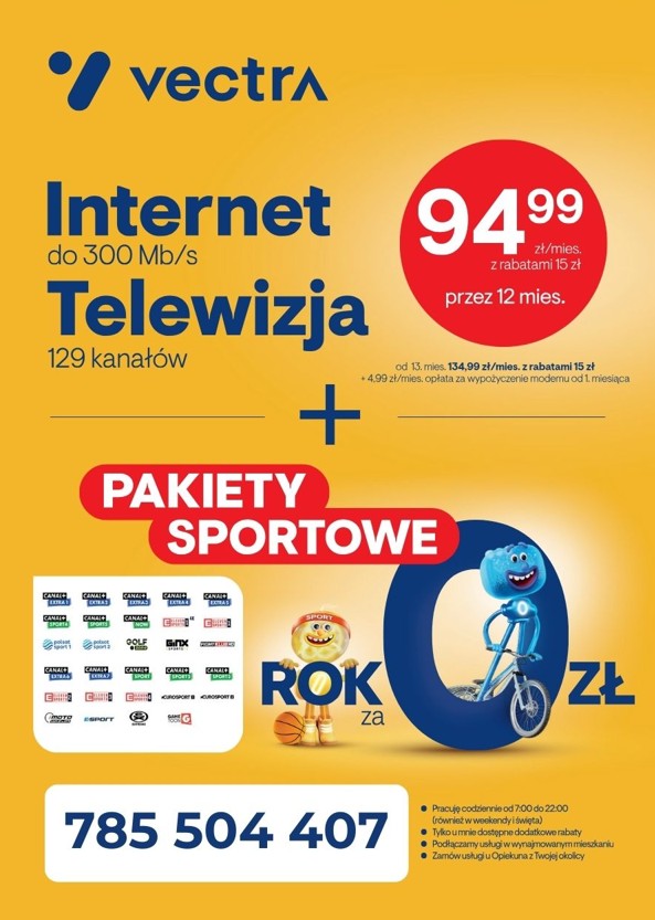 Nowych i obecnych klientów Vectry zachęcamy również do skorzystania z wyjątkowej oferty na abonamenty komórkowe 5G. Nowi klienci przenoszący numer do Vectry otrzymują usługę przez cały rok bez opłat, a następnie korzystają z jednego z elastycznych planów w bardzo atrakcyjnych cenach. Ilość numerów do przeniesienia jest dowolna, promocja obejmuje każdy z przenoszonych numerów. A jeśli jesteś już klientem Vectry, będziesz zwolniony z opłat aż przez 14 miesięcy!